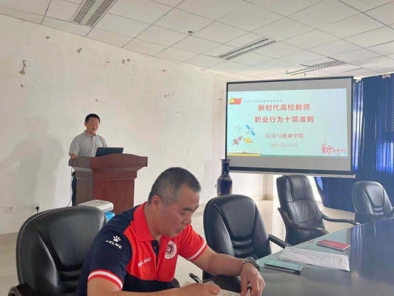 姚思勤同志带领全体教职工共同学习《新时代高校教师职业行为十项准则》,《准则》是新时代对广大教师落实立德树人根本任务提出新的更高要求,为进一步增强教师的责任感、使命感、荣誉感,规范职业行为,明确师德底线,引导广大教师努力成为有理想信念、有道德情操、有扎实学识、有仁爱之心的好老师,着力培养德智体美劳全面发展的社会主义建设者和接班人。同时从坚定政治方向、自觉爱国守法、传播优秀文化、潜心教书育人、关心爱护学生、坚持言行雅正、遵守学术规范、秉持公平诚信、坚守廉洁自律、积极奉献社会十条准则结合实例向全体教职工进行了详细的解读。