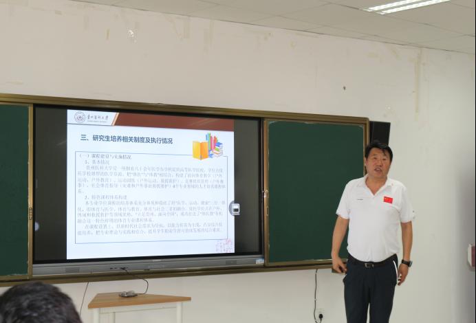 院长国伟针对学院当前体育学科及硕士学位点建设工作现状,从总体概况、研究生党建与思想政治教育工作、研究生培养相关制度及执行情况、研究生教育改革情况、教育质量评估与分析、改进措施等方面进行了详细的汇报。